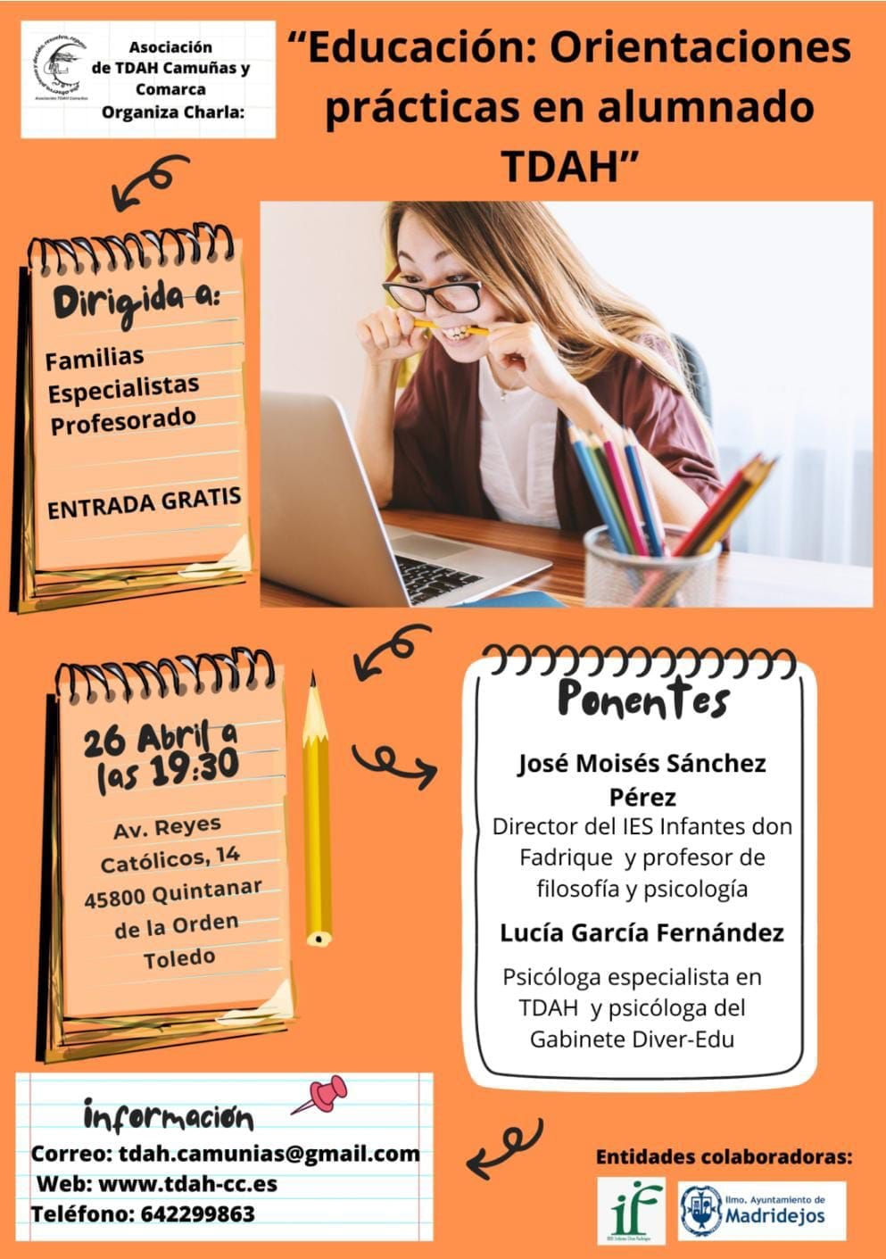 Muchas gracias al equipo directivo, especialmente a María Antonia Palomino por organizar este acto; a l@s alumn@s, profesorado y tutores/as que se han implicado tanto; miembros del AMPA Cristina Gutiérrez y María Sobrino; al alcalde Juan Carlos Navalón López-Brea y al teniente-alcalde José María Viller Mota; al Ayuntamiento de Quintanar de la Orden por cedernos las instalaciones y, en definitiva, a toda la comunidad educativa del IES Infante don Fadrique.
